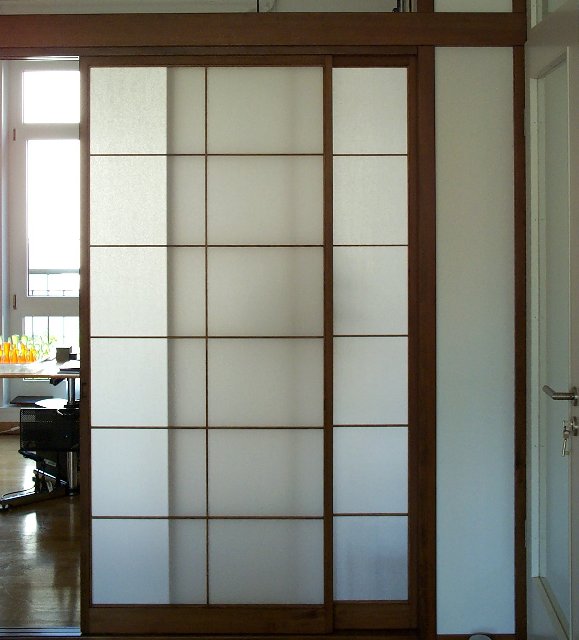 In dieser Wohnung in Berlin wurde mit Shoji eine leichte und lichtdurchlässige Raumteilung im japanischen Stil eingebaut. Die Shoji-Schiebetüren aus dunklem Holz trennen das Homeoffice vom Wohnraum. Die Wandelemente rechts und links vom Shoji-Raumteiler verdecken zwei hohe Bücherregale. Für die Bespannung der Shoji haben wir traditionelles, rein weißes Shojipapier ohne Struktur verwendet.