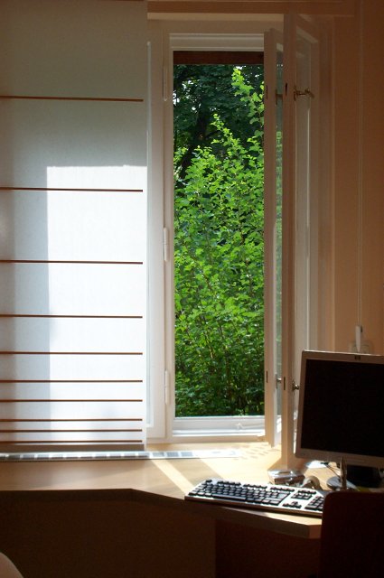 Flächenvorhänge am Fenster, Shoji-Schiebetüren als Durchgang und als Schrankfront, Kiefer